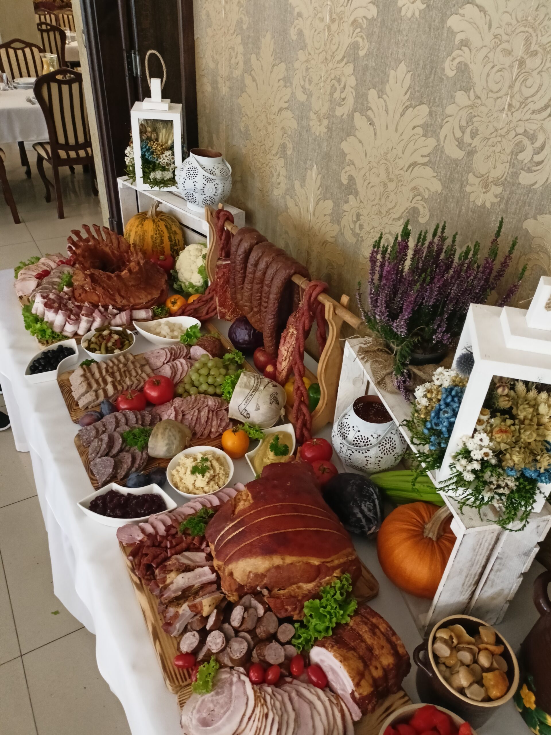 Schab pieczony z kością w kształcie korony. Gotowy do podania na zimno lub na ciepło. Waga schabu to ok 5-6 kg. Dopuszczamy